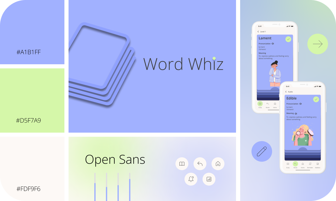 Wordwhiz supports a simple flow — users set learning goals, explore new words with audio and examples, revisit quizzes, and track their progress over time.